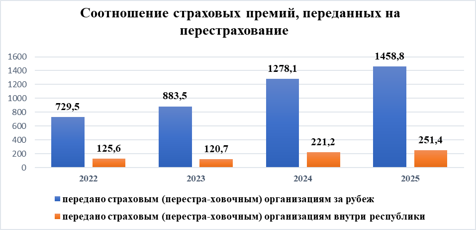 По итогам 2025 года объем страховых премий, переданных на перестрахование, увеличился по сравнению с 2024 годом на 210,9 млн сомов, или на 14,1% (с 1 499,3 до 1 710,2 млн сомов). Рост был обусловлен увеличением передачи премий иностранным перестраховщикам на 180,7 млн сомов (14,1%), а также расширением перестрахования внутри республики на 30,2 млн сомов (13,7%).