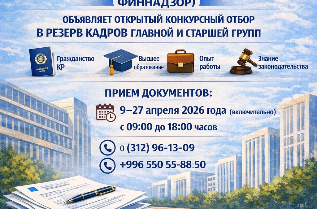 Служба регулирования и надзора за финансовым рынком при Министерстве экономики и коммерции Кыргызской Республики (Финнадзор) объявляет открытый конкурсный отбор в резерв кадров на замещение вакантных административных государственных должностей главной и старшей групп в соответствии с Законом Кыргызской Республики «О государственной гражданской службе и муниципальной службе».